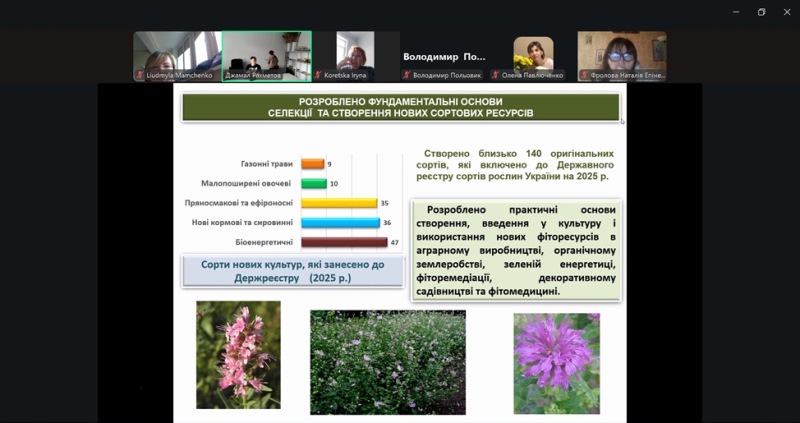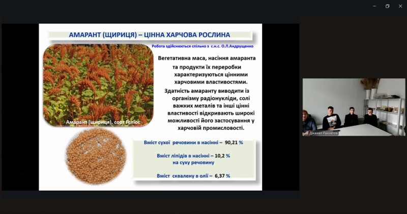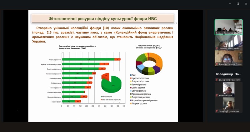 Головний доповідач семінару, д.с-г.н., член-кореспондент НАН України, заступник директора НБС, завідувач відділу культурної флори, професор Джамал Рахметов презентував тему «Нові та нетрадиційні фіторесурси для використання у сучасних харчових технологіях». Він розповів про нові види та сорти їстівних рослин і поділився результатами проведених досліджень щодо можливості їх використання у харчових технологіях.