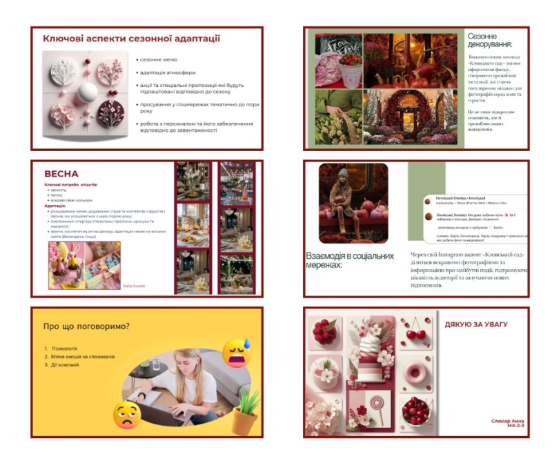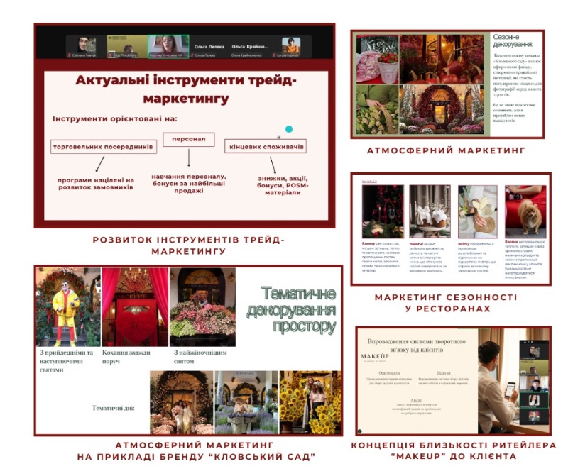 Інструментарій трейд-маркетингу, рекламні ігри розуму та вплив на свідомість, емоційні квести в маркетингу, кейс із клієнтською близькістю «MAKEUP», квітковий букет атмосферного маркетингу «Кловського саду» та калейдоскоп сезонного маркетингу в ресторанах – лише окремі напрями досліджень, представлені здобувачами кафедри.