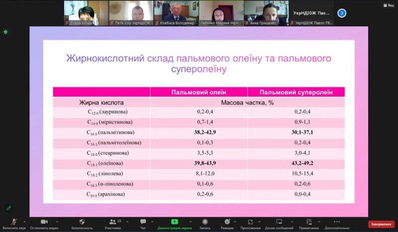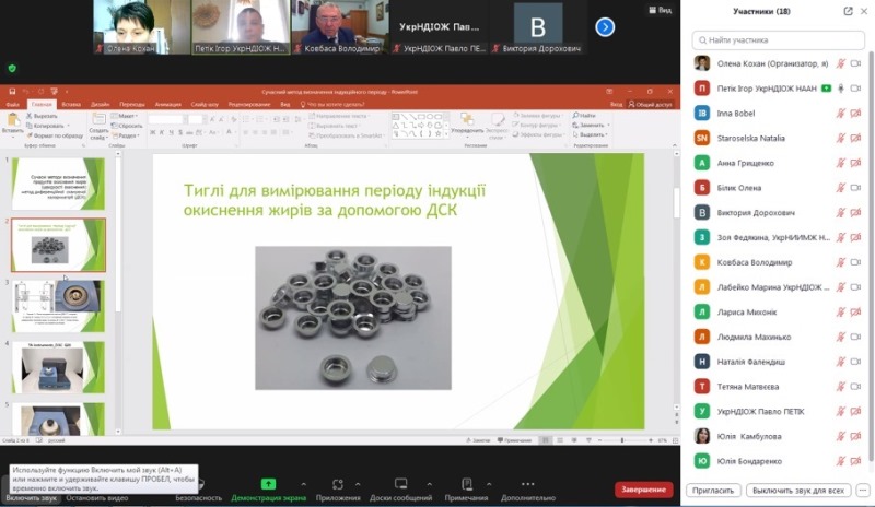 Цього разу було заслухано два виступи. Завідувач лабораторії відділу досліджень технології переробки олій та жирів, к.т.н. Ігор Петік представив доповідь «Сучасні методи визначення продуктів окиснення жирів (швидкості окиснення). Метод диференційної скануючої калориметрії (ДСК)». Наукова співробітниця відділу досліджень технології переробки олій та жирів УкрНДІОЖ, к.т.н. Марина Лабейко свою доповідь присвятила темі «Застосування пальмового олеїну в продуктах харчування». Наприкінці семінару усі учасники мали змогу поставити запитання доповідачам.