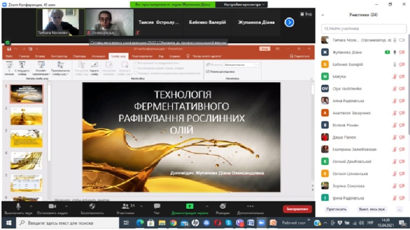 У рамках 87-ї Міжнародної наукової конференції молодих учених, аспірантів і студентів «Наукові здобутки молоді – вирішенню проблем харчування людства у XXI столітті» відбулося засідання секції «Технологія рослинних олій, жирових та парфумерно-косметичних виробів» кафедри технології жирів, хімічних технологій харчових добавок та косметичних засобів.