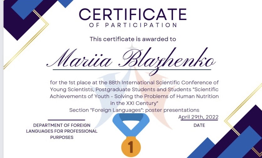Чудова новина надійшла з кафедри іноземних мов професійного спрямування – здобувачі НУХТ взяли активну участь у роботі секції «Іноземні мови» 88-ї Міжнародної наукової конференції молодих учених, аспірантів і студентів «Наукові здобутки молоді – вирішенню проблем харчування людства у ХХІ столітті», яка працює онлайн у квітні-травні 2022 року. У співпраці з викладачами кафедри опубліковано 50 тез наукових доповідей і 14 постерів стендових доповідей.