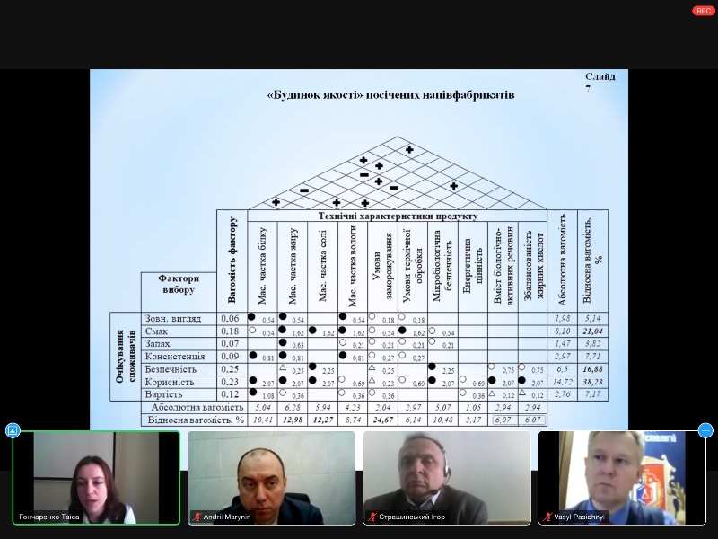 Участь у засіданні брали: голова спеціалізованої вченої ради, д.т.н., професор, завідувач кафедри технології м’яса і м’ясних продуктів Василь Пасічний, рецензенти – д.т.н., професорка, завідувачка кафедри технології молока і молочних продуктів Галина Поліщук і к.т.н., доцент кафедри технології м’яса і м’ясних продуктів Ігор Страшинський, офіційні опоненти – д.т.н., професорка, завідувачка кафедри технології м’яса ХДУХТ Марина Янчева та к.т.н., доцентка кафедри технології м’ясних, рибних та морепродуктів НУБіП України Оксана Штонда.