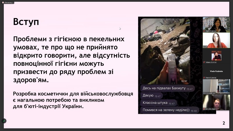 1 місце – Аніта Пастух (група ХТ-1-16М) за доповідь «Косметичні продукти для використання у військово-польових умовах – новий виклик для б'юті-індустрії України»