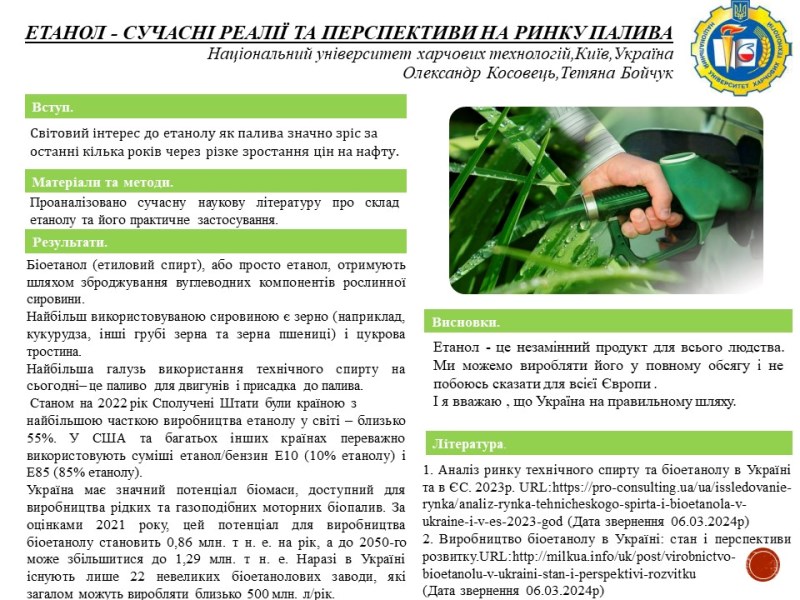 3 місце – Олександр Косовець (група ХТ-3-14) за доповіді «Удосконалення рецептури миючого засобу з додаванням SiO2» та «Етанол – сучасні реалії та перспективи на ринку палива»