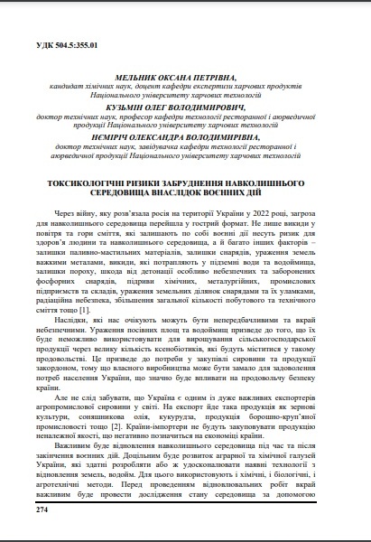 Через війну, яку розв’язала росія на території України, загроза для навколишнього середовища перейшла у гострий формат. Наші викладачі й науковці не стоять осторонь і долучаються до пошуків шляхів зменшення негативного впливу воєнних дій на здоров’я людини та навколишнє середовище. Зокрема, стаття «Токсикологічні ризики забруднення навколишнього середовища внаслідок воєнних дій» спільно підготовлена доценткою кафедри експертизи харчових продуктів Оксаною Мельник і фахівцями кафедри технології ресторанної і аюрведичної продукції, професорами Олегом Кузьміним і Олександрою Нєміріч оприлюднена у збірнику матеріалів Наукового форуму «Протидія терористичним актам у міському середовищі». Результати своїх досліджень за цією тематикою наші викладачі представили у секції «Вплив терористичних актів на навколишнє природне середовище у містах та здоров’я людини».