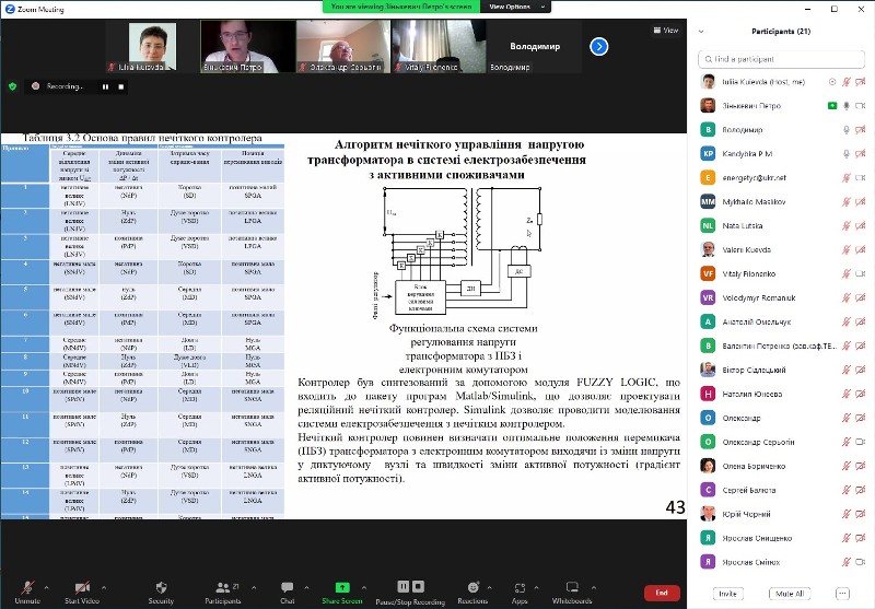 21 вересня на кафедрі електропостачання і енергоменеджменту відбувся науковий фаховий семінар випускника аспірантури, здобувача освітньо-наукового ступеня доктора філософії за спеціальністю «Електроенергетика, електротехніка та електромеханіка» Петра Зінькевича.