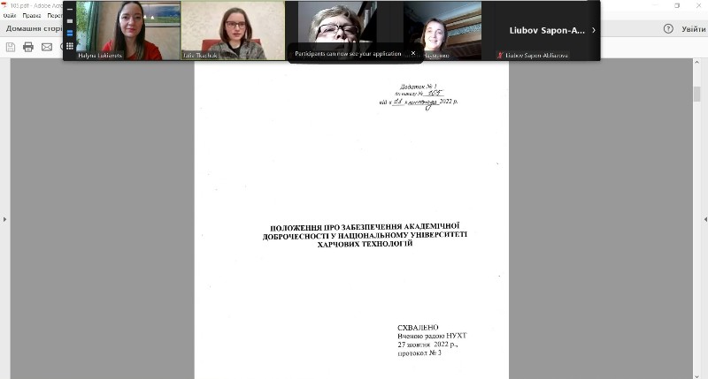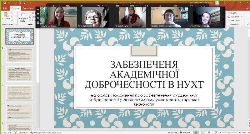 Юлія Ткачук доповіла про забезпечення академічної доброчесності в НУХТ на основі Положення про забезпечення академічної доброчесності у Національному університеті харчових технологій. Вона охарактеризувала основні завдання забезпечення академічної доброчесності в університеті, а також перелічила заходи, які організовують і проводять в університеті для створення позитивного, сприятливого й доброчесного освітнього і наукового середовища.