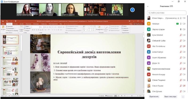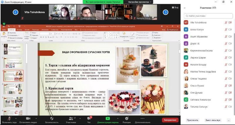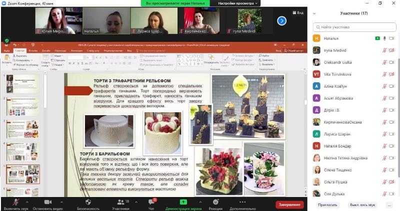 Фахівчиня-практик ознайомила викладачів кафедри з асортиментом кондитерських виробів, популярних серед споживачів, а також із новими тенденціями в оформленні тортів і тістечок, інноваційними технологіями оздоблювальних напівфабрикатів для декорування виробів.
