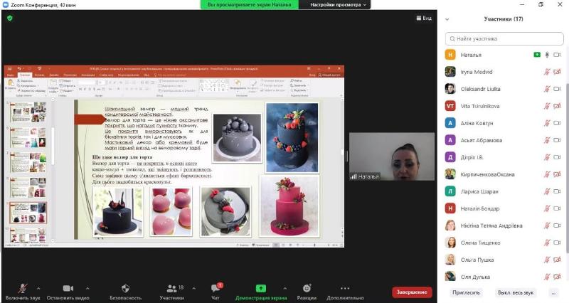 Лекторка більш детально охарактеризувала класифікацію оздоблювальних виробів, критерії вибору інгредієнтів, які забезпечують якість виробів, технологію приготування тістечок, бісквітів, техніку оформлення.