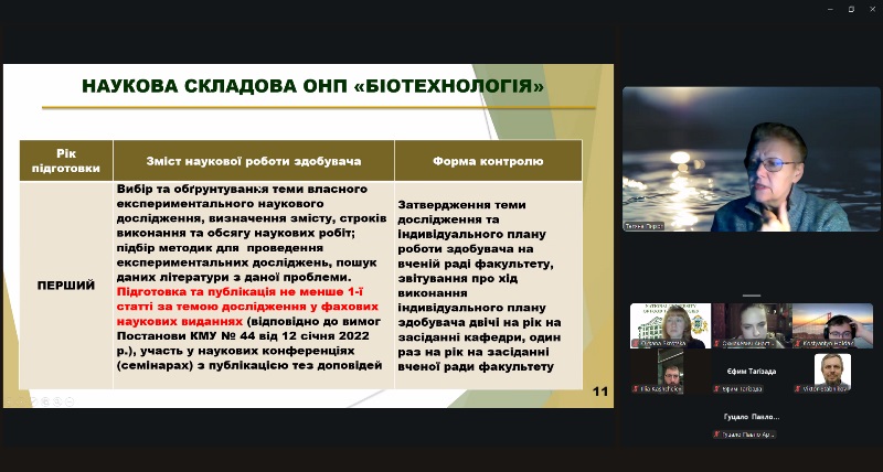 Під час зустрічі також було обговорено питання дотримання академічної доброчесності, вимоги до індивідуального плану аспіранта, щорічного звітування, публікаційної активності та етапів підготовки й захисту дисертації.