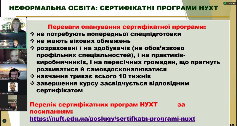 Гарантка програми ознайомила здобувачів із особливостями навчання за освітньо-науковою програмою, яка акредитована з визначенням «зразкова». Учасники зустрічі дізналися про структуру програми, вибіркові компоненти, можливості внутрішньої академічної мобільності, неформальної освіти та сертифікатних програм НУХТ. Окрему увагу було приділено питанням дуальної освіти, що дозволяє поєднувати теоретичну підготовку з практичним досвідом на виробництві.