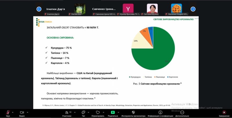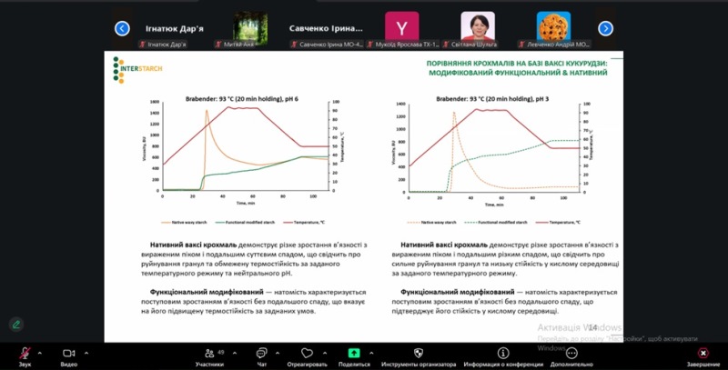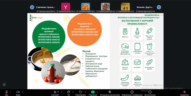 У перші дні грудня інженер-технолог компанії Interstarch Україна Артем Баралюк на запрошення директорки Навчально-наукового інституту харчових технологій Оксани Кочубей-Литвиненко прочитав онлайн-лекцію на тему «Застосування модифікованих крохмалів Interstarch в харчовій промисловості». Заявлена тематика зацікавила багатьох здобувачів спеціальності «Харчові технології», які навчаються у бакалавраті за освітньо-професійною програмою «Харчові технології та інженерія», та магістрантів освітніх програм «Технології зберігання, консервування та переробки молока», «Технології хліба, кондитерських, макаронних виробів та харчоконцентратів», «Технології органічних харчових продуктів», «Технології цукрів, полісахаридів і підготовки води в промислових та крафтових виробництвах».