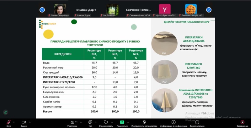 Лектор надав кваліфіковану професійну інформацію щодо властивостей модифікованих крохмалів із восковидної кукурудзи гарячого і холодного набухання та регулярної кукурудзи. Поділився технологічними аспектами їх використання під час виробництва молочних продуктів, соусів, кондитерських виробів та інших харчових продуктів.