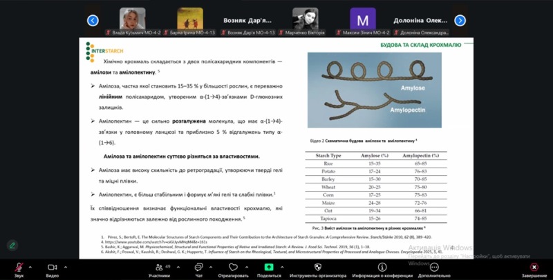 Лекційний матеріал супроводжувався інтерактивною візуалізацією, яка дозволила здобувачам освіти краще зрозуміти механізм дії модифікованих крохмалів у харчових системах.