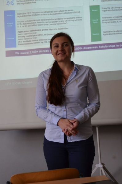 Під час презентації слухачі дізналися від директора українського представництва Анни Анзіної про особливості професійних освітніх програм CFA, вимоги до бажаючих навчатися, професійні і кар’єрні перспективи розвитку в Україні і світі. Анна Анзіна повідомила, що кандидати на вступ на програму CFA повинні мати освіту не нижче рівня бакалавра, підкреслила, що рівень теоретичних знань більшості кандидатів з України (будь-яких економічних спеціальностей) відповідає базовим вимогам навчання і наголосила, що навчання на програмах CFA не є заміною традиційної університетської освіти, а виступає її доповненням для тих, хто прагне глибокого професійного розвитку. Ця інформація викликала неабиякий інтерес серед студентської аудиторії.