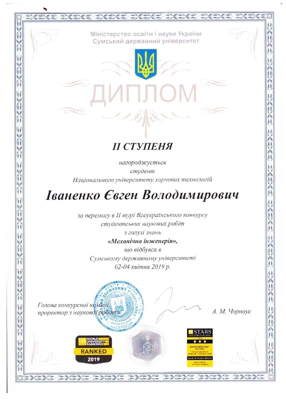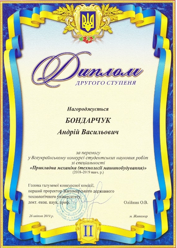 Зокрема, на конкурсах студентських наукових робіт з дисциплін «Технологічні основи машинобудування» та «Прикладна механіка (технології машинобудування)» студенти Євген Іваненко (керівник – професор Євгеній Штефан) та Андрій Бондарчук (керівник – доцент Юрій Бойко) посіли другі місця та одержали Дипломи ІІ ступеня.