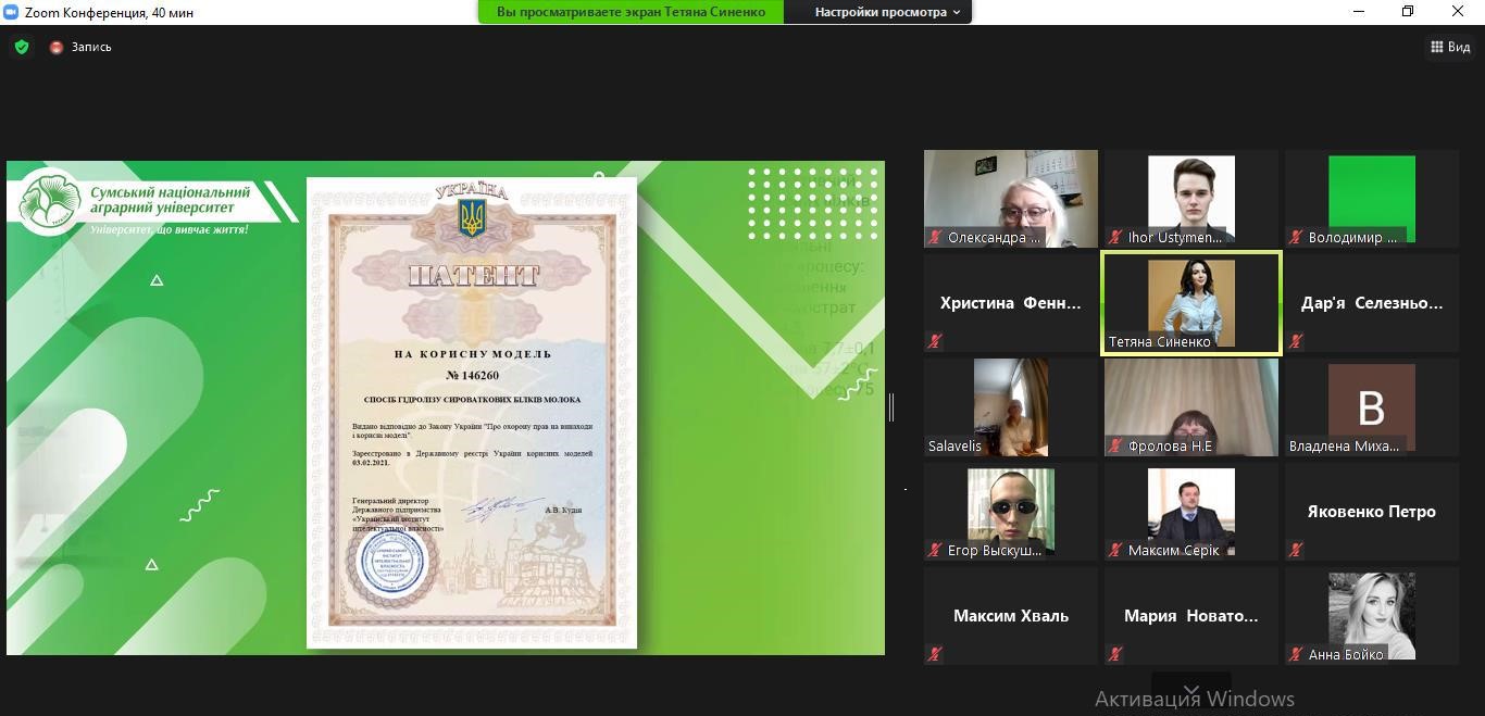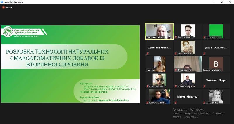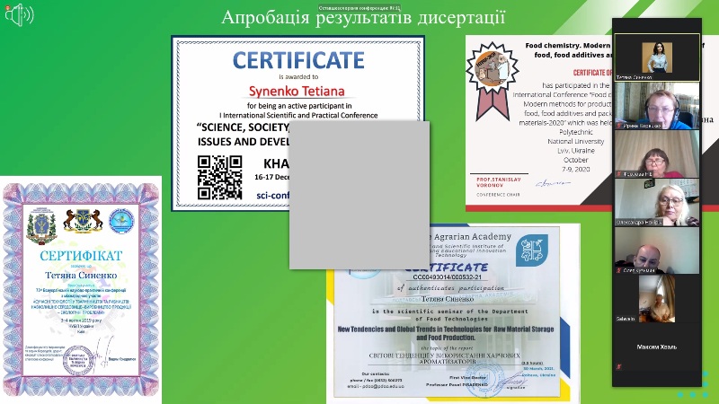Здобувачка 3-го рівня вищої освіти 2 року навчання Тетяна Синенко (наукова керівниця – професора Наталія Фролова) у доповіді «Розроблення технології натуральної смакоароматичної добавки» висвітлила результати наукових досліджень щодо використання вторинної сировини у складі натурального ароматизатора.
