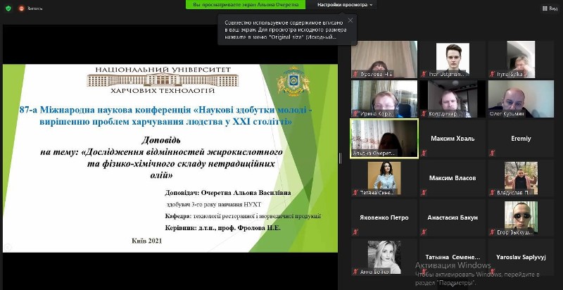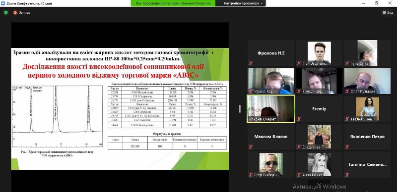 Заслухавши доповідь «Дослідження відмінностей жирокислотного та фізико-хімічного складу нетрадиційних олій», представлену здобувачкою освітньо-наукового ступеня «Доктор філософії» 3-го року навчання Альоною Очеретною (наукова керівниця – професорка Наталія Фролова), слухачі дізналися про нетрадиційні види олій, які за показниками якості можна та доцільно застосовувати у харчових технологіях із метою підвищення харчової цінності за рахунок балансування жирнокислотного складу кулінарної продукції.