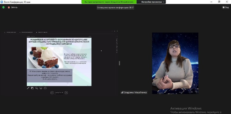 Із доповіддю «Розширення асортименту борошняних кондитерських виробів спеціального призначення шляхом використання нетрадиційної сировини» виступила здобувачка освітньо-наукового ступеня «Доктор філософії» 3-го року навчання Владлена Михайленко (наукова керівниця – професорка Олександра Нєміріч).