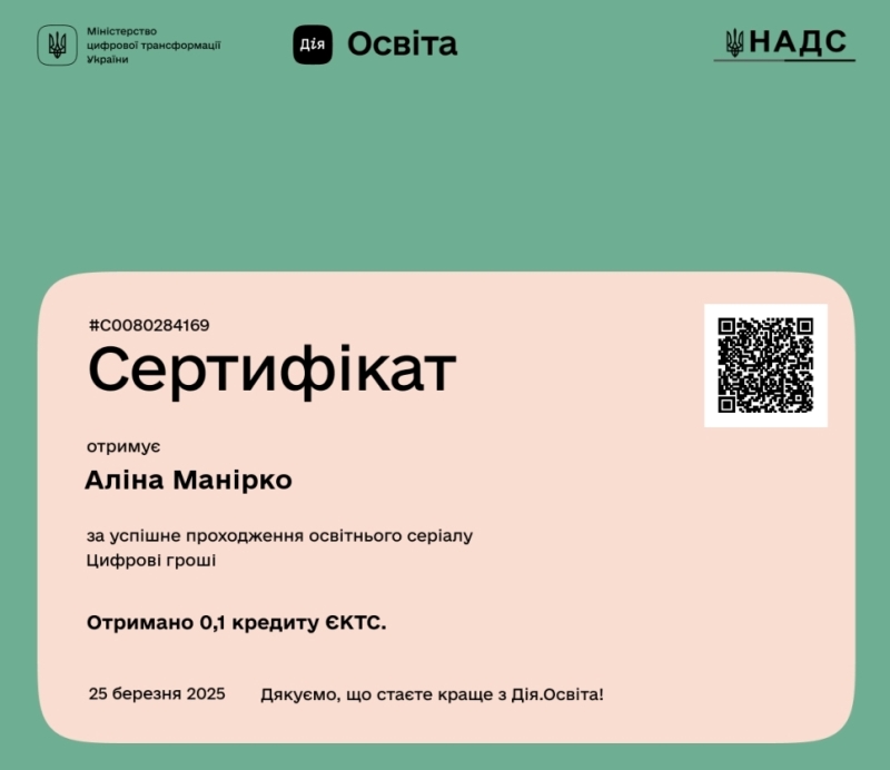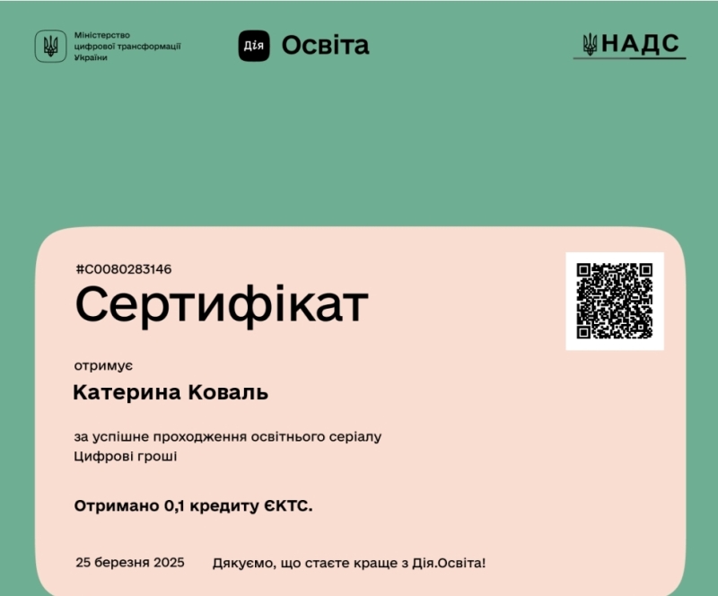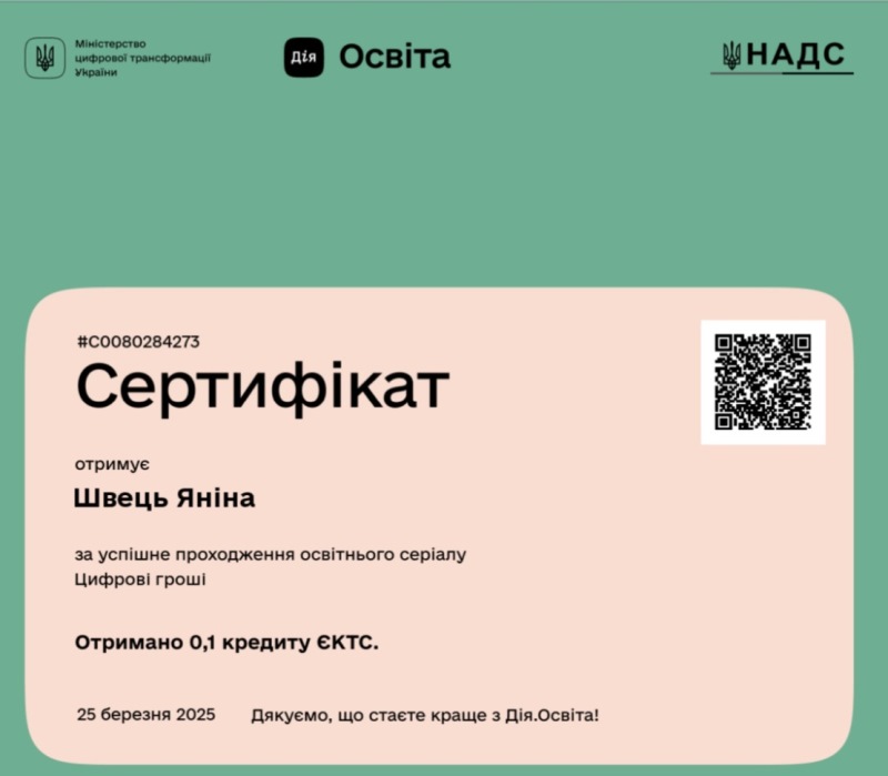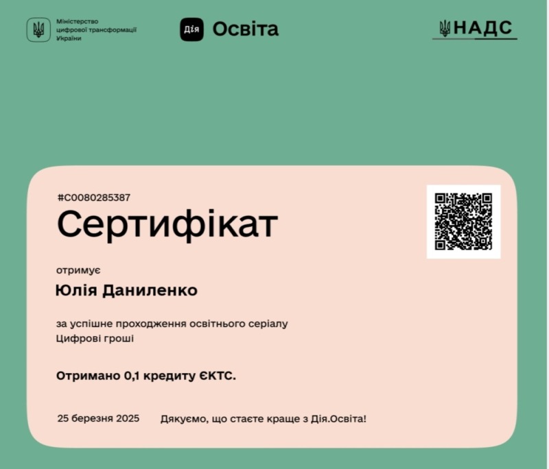 У рамках вивчення курсу «Банківська справа» для закріплення отриманих знань за темою «Операції банків з обслуговування безготівкового грошового обороту» здобувачі третього курсу групи ФІ-3-11 спеціальності 072 «Фінанси, банківська справа, страхування та фондовий ринок» разом із викладачкою, к.е.н. Юлією Даниленко прослухали освітній серіал «Цифрові гроші» на платформі Дія.Освіта та отримали відповідні сертифікати.