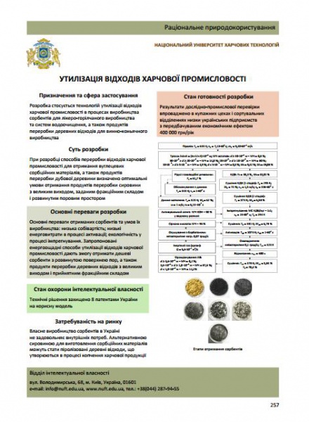 Ще одна розробка науковців НУХТ «Утилізація відходів харчової промисловості» розміщена у розділі «Раціональне природокористування». Вона стосується технологій утилізації відходів харчової промисловості в процесах виробництва сорбентів для лікеро-горілчаного виробництва та систем водоочищення, а також продуктів перероблення деревних відходів для винно-коньячного виробництва Результати дослідно-промислової перевірки впроваджені в купажних цехах і сортувальних відділеннях низки українських підприємств із передбачуваним економічним ефектом 400 тис. грн/рік. Технічні рішення захищені 8 патентами України на корисну модель.
