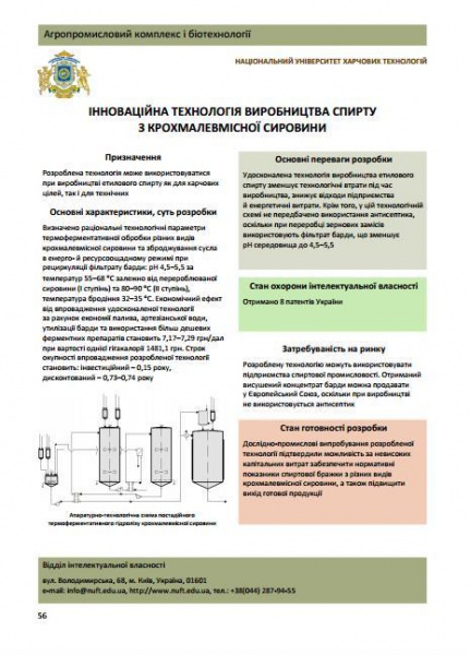 У розділі «Агропромисловий комплекс і біотехнології» розміщена інформація про розробку «Інноваційна технологія виробництва спирту з крохмалевмісної сировини», яка може використовуватися при виробництві етилового спирту, як для харчових цілей, так і для технічних. Удосконалена технологія виробництва етилового спирту зменшує технологічні втрати під час виробництва, знижує відходи підприємства й енергетичні витрати. Крім того, у цій технологічній схемі не передбачено використання антисептика, оскільки при переробленні зернових замісів використовують фільтрат барди, що зменшує рН середовища до 4,5–5,5. Розробники технології отримали 8 патентів України.