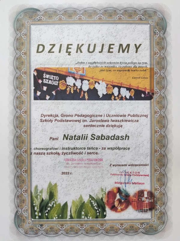 Доцентка кафедри технології жирів, хімічних технологій харчових добавок та косметичних засобів Наталія Сабадаш долучилася до святкування та внесла ноту української культури. Під її керівництвом були підготовлені хореографічні номери під композицію українського гурту The Hardkiss «Stones» і Злати Огневич «За лісами-горами», які за змістом чудово вписались у тематику свята. Директорка навчального закладу Мавгожата Малімон відзначила Наталію Сабадаш Подякою за увагу та час приділений учням.