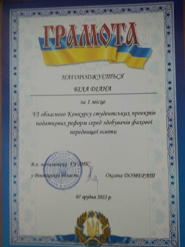 Діана Біла (спеціальність «Менеджмент») та Іван Консевич (спеціальність «Харчові технології») успішною представили свої науково-пошукові роботи у номінаціях «Державні податки та збори» і «Реформування податкового менеджменту» на обласному конкурсі студентських проєктів податкових реформ, що проводився серед студентів фахової передвищої освіти, і здобули перші місця.
