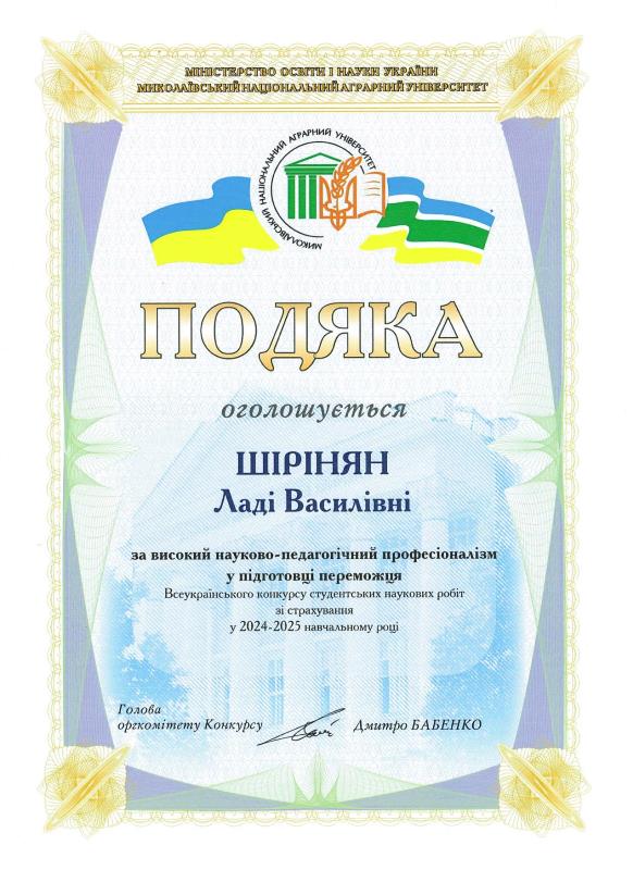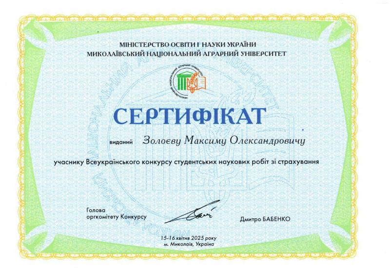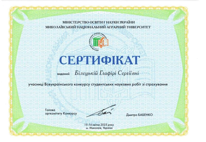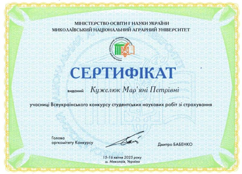 Здобувачі-фінансисти Денис Ромась, Глафіра Білецька, Мар’яна Кужелюк, Максим Золоєв під керівництвом професорки Лади Шірінян взяли участь у Всеукраїнському конкурсі студентських наукових робіт зі страхування, що відбувся на базі Миколаївського національного аграрного університету.