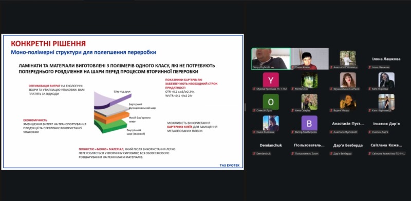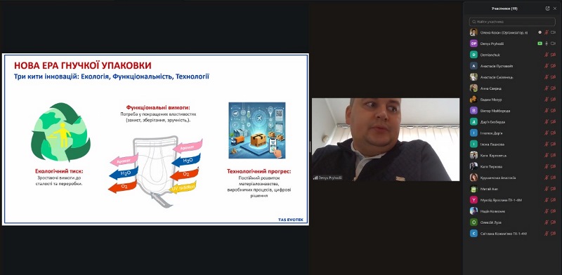 Лектор закцентував увагу здобувачів освіти на основних тенденціях при розробленні гнучких пакувальних матеріалів для харчових продуктів зі врахуванням їх функціональних властивостей, технологічності та впливу на довкілля. Детально зупинився на необхідності розроблення пакувальних матеріалів саме з монополімерів із заданими бар’єрними властивостями, для забезпечення максимально ефективного перероблення використаної упаковки. Фахівець навів ефективні рішення, розроблені компанією, для забезпечення реалізації принципів сталого розвитку при пакуванні харчових продуктів. Після викладення основного матеріалу лектор ґрунтовно відповів на всі запитання, що виникли у аудиторії слухачів.