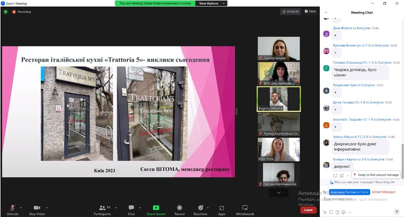 До роботи секції долучився ще один успішний випускник – Євген Штома, який тільки у лютому цього року здобув освітній ступінь магістра з готельно-ресторанної справи, а нині є менеджером ресторану італійської кухні «Trattoria 5». Євген розповів присутнім про концептуальну діяльність ресторану, унікальне дизайнерське рішення обідніх залів закладу та особливості формування меню, умови функціонування ресторанних підприємств у період воєнного стану та перспективи у післявоєнний час. Фахівець наполегливо рекомендував студентам не вагатися і продовжувати навчання у рідному університеті на другому магістерському рівні вищої освіти. Викладачі вдячні Євгену за теплі відгуки про факультет, кафедру, університетські роки.