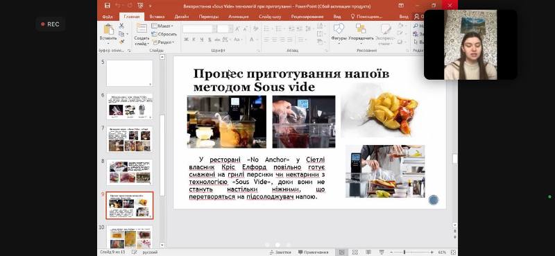 У рамках роботи секції «Готельно-ресторанна справа» були заслухані доповіді здобувачів освіти: «Перспективний спосіб випікання вівсяного хліба» Анастасії Різник (наукова керівниця – професорка Тетяна Сильчук); «Особливості надання готельних послуг та їх вплив на побудову обліку і аналізу фінансових результатів» Аліни Білик (наукові керівники – доценти Юрій Ткачук і В’ячеслав Губеня); «Інформаційні технології як інструмент підвищення ефективності підприємств готельного бізнесу» Анастасії Широбокової, «Вплив застосування сучасних клінінгових технологій на зростання прибутку готелю» Анни Нечипорук (наукова керівниця обох – доцентка Тетяна Нікітіна); «Використання «Sous Vide» технологій при приготуванні напоїв у барі» Ірини Винник (наукова керівниця – доцентка Ольга Пушка).