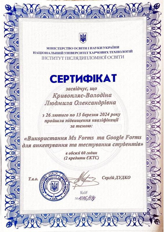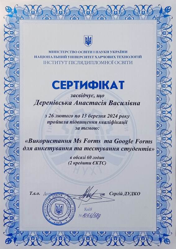 Викладачки кафедри мехатроніки та пакувальної техніки, професорка Людмила Кривопляс-Володіна та доцентка Анастасія Деренівська успішно пройшли підвищення кваліфікації за темою «Використання MS Forms та Google Forms для анкетування та тестування студентів». Вони отримали новий досвід із використання програмних засобів для проведення онлайн-опитувань і тестування.