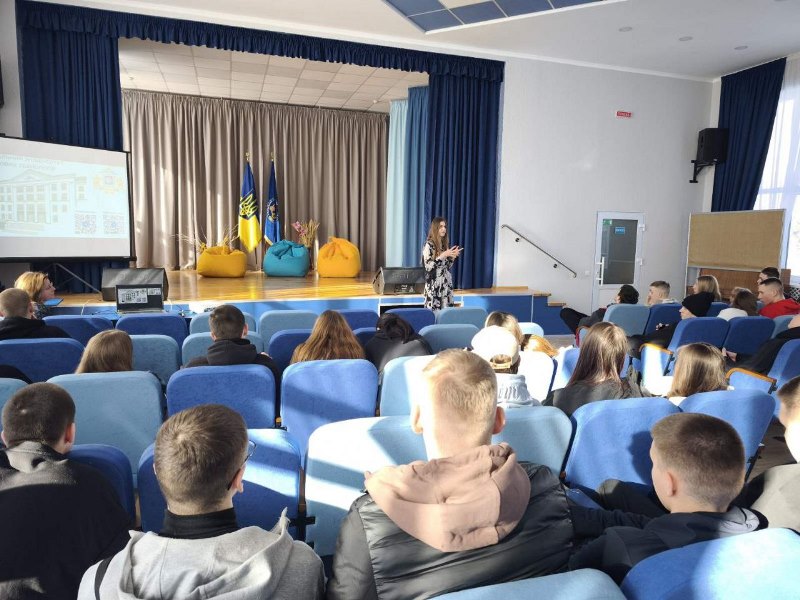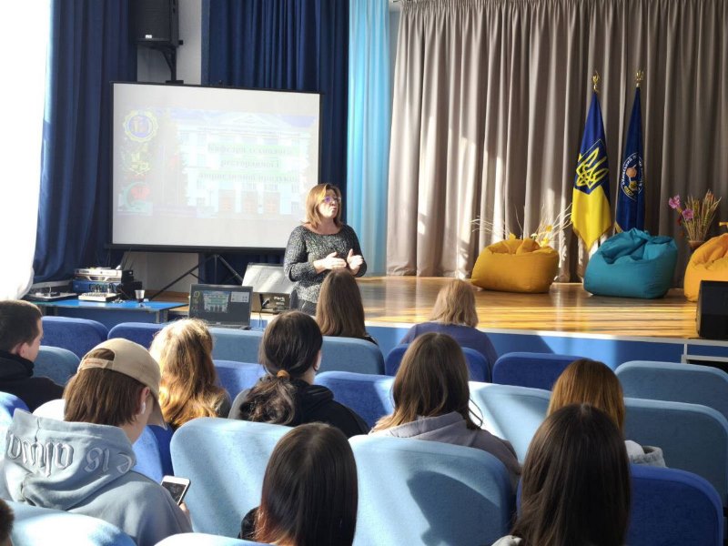 Після офіційної зустрічі відбулася профорієнтаційна лекція для випускних груп третього курсу «Кухар; офіціант» та «Кухар; продавець продовольчих товарів». Завідувачка кафедри технології ресторанної і аюрведичної продукції професорка Олександра Нєміріч та асистентка Марія Омельченко детально розповіли про освітні програми, можливості навчання в НУХТ, а також умови вступу у 2025 році. Особливу увагу приділили перспективам працевлаштування та професійного розвитку випускників.