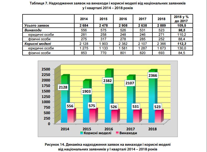 За цей період відділ економіки та статистики інтелектуальної власності Укрпатенту відзначає зростання винахідницької активності національних заявників. Ними подано близько 2,9 тисячі заявок на винаходи і корисні моделі, що на 9,5 % більше проти аналогічного періоду 2017 року. Зокрема, цього року порівняно з 2017-м спостерігалося збільшення надходження заявок на винаходи і корисні моделі від юридичних осіб у галузях «Освіта» (на 20,1 %) і «Наукові дослідження та розробки» (на 76,6 %). Так, закладами освіти подані 1 262 заявки на винаходи і корисні моделі (64,9 % від загальної кількості).