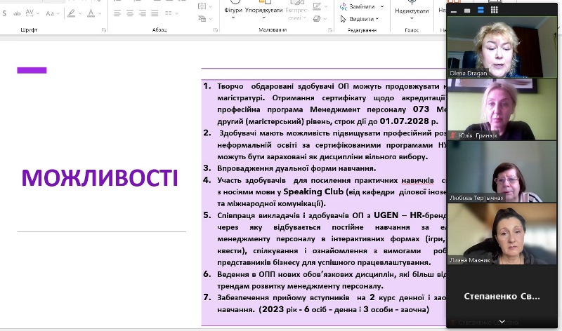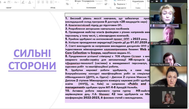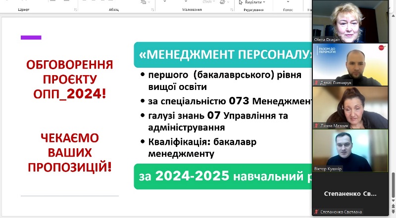 25 січня 2024 року відбулося розширене засідання робочої групи бакалаврської освітньо-професійної програми «Менеджмент персоналу» за участю здобувачів освіти 1-4 курсів, стейкхолдерів-HR-практиків, викладачів, задіяних у викладанні дисциплін за освітньою програмою, для обговорення результатів локального моніторингу освітньо-професійної програми «Менеджмент персоналу» 2023 року, її сильних і слабких сторін із метою її подальшого удосконалення у 2024 році.