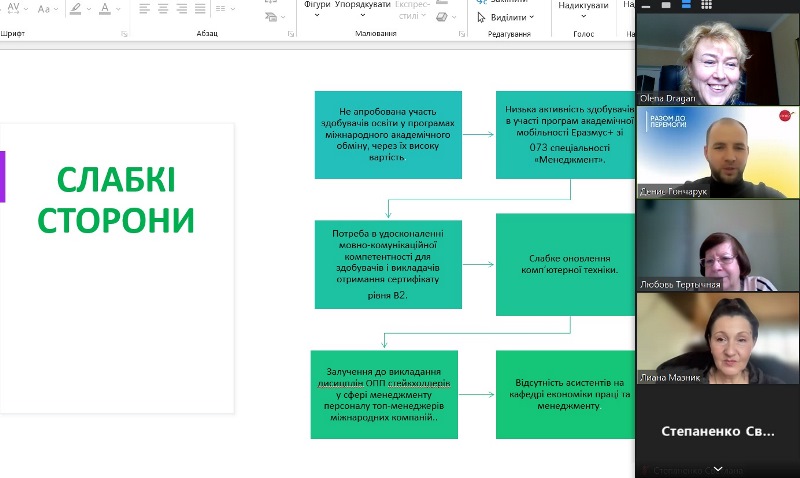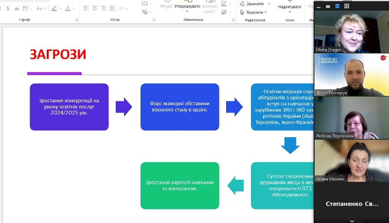 Гарантка програми ‒ професорка Олена Драган доповіла учасникам зустрічі про забезпечення якості освітньої програми та освітню діяльність на підставі результатів проведеного локального моніторингу: унікальність програми; рівень кадрового, методичного і наукового забезпечення, виконання рекомендацій, наданих експертною групою і галузевою експертною радою під час акредитації (березень 2023) та визначення напрямків підвищення якості освітньої програми й забезпечення її відповідності критеріям оцінювання якості освітніх програм.