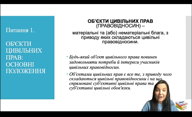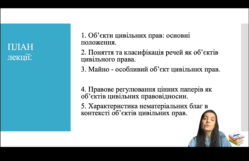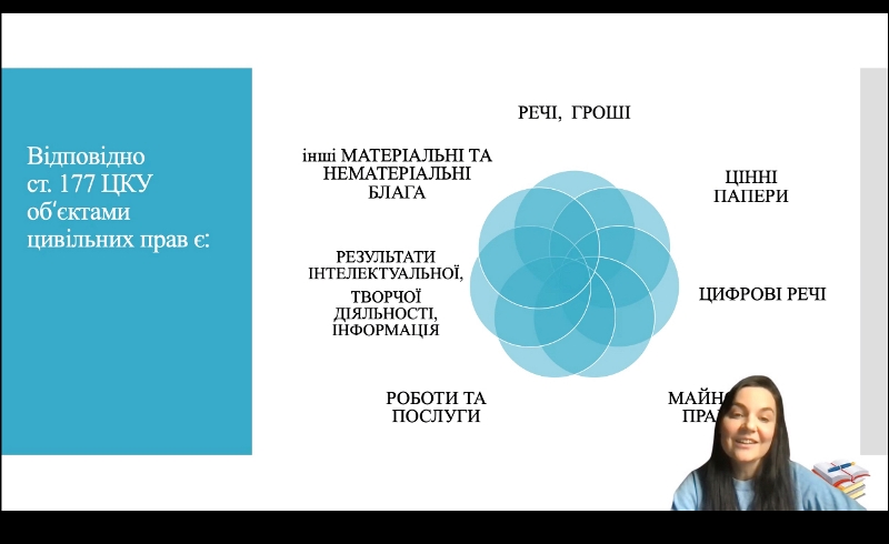 Викладачка змістовно та доступно, із застосуванням презентаційного матеріалу, інструментів дискусії та прикладів із життя розповіла про об’єкти права власності та їх форми, що сприяє формуванню теоретичної основи для роботи здобувачів на практичних заняттях.