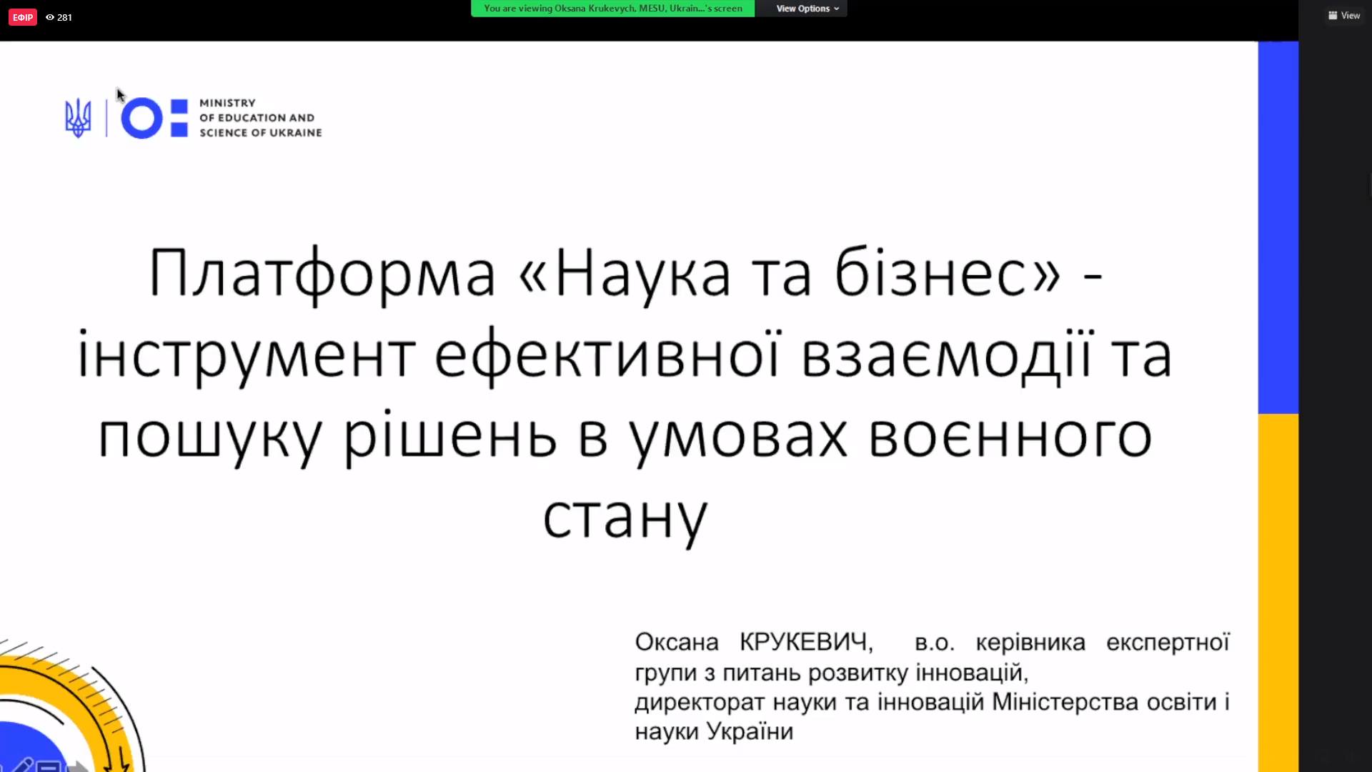 В.о. керівника експертної групи з питань розвитку інновацій Міністерства освіти і науки України Оксана Крукевич презентувала інструмент ефективної взаємодії та пошуку рішень в умовах воєнного стану – платформу «Наука та бізнес». Це онлайн-майданчик для комунікації та ефективної взаємодії представників бізнесу та наукової спільноти, що розпочав роботу 1 лютого 2022 року.