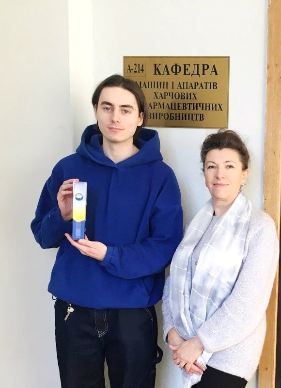 Магістрант Іван Салига разом із командою вчених кафедри машин і апаратів харчових та фармацевтичних виробництв – професором Олександром Гаввою та доцентками Наталією Кулик і Оленою Чепелюк отримав патент України на корисну модель – упаковку-підставку пенального типу для ліхтарика.