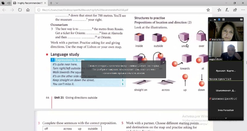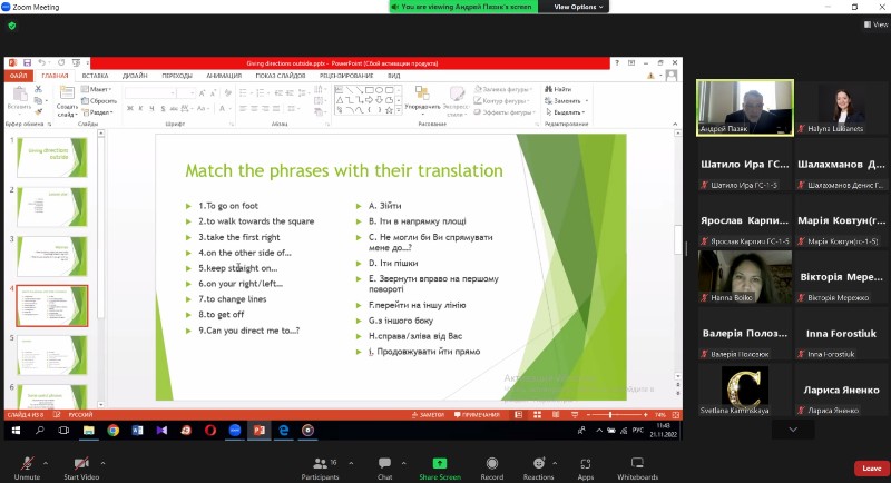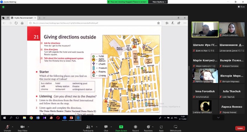 Для проведення заняття була використана платформа Zoom і наочні засоби у вигляді презентації у PowerPoint. Студенти прослуховували аудіозаписи, вивчаючи специфічні фрази і конструкції, що використовуються для того, щоб розпитати про місцезнаходження певних міських об’єктів і шлях до них, також вчилися вказувати шлях англійською мовою, користуючись картою. Для того, щоб організувати парну роботу, використовувалась технологія «Сесійні зали». Студенти виявляли цікавість, були активні і старались працювати з максимальною ефективністю.