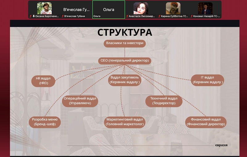 Лекторка проілюструвала типову структуру управління – власники й інвестори, СЕО, операційний, маркетинговий, HR, фінансовий, технічний та ІТ напрями, відділ закупівель і блок розроблення меню на чолі з бренд шефом – із зонами відповідальності та взаємодією підрозділів.
