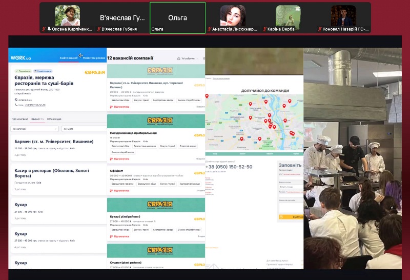 Далі перейшли до освіти і працевлаштування: де опановують професії кухаря, бариста, сушиста, офіціанта та адміністратора; як проходить стажування в мережевих закладах; на яких майданчиках шукати вакансії. Фахівчиня наголосила, що рівень заробітку в сфері ресторанного бізнесу сьогодні є конкурентним, водночас сильно залежить від кваліфікації працівника, розташування закладу та інших чинників.