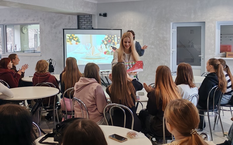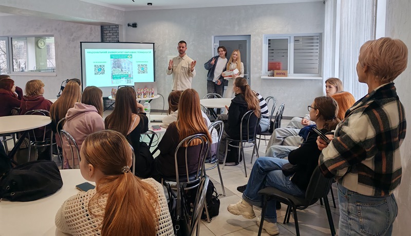 Напередодні новорічних свят у Київському професійному коледжі сфери послуг панувала особлива атмосфера – поєднання науки, креативу та святкового настрою. У межах співпраці між закладами освіти заступник відповідального секретаря Приймальної комісії НУХТ, старший викладач кафедри технології ресторанної і аюрведичної продукції Артем Ущаповський, асистентка кафедри Марія Омельченко, здобувачі освіти Анна Омельченко (група ХЧ-1-2) та Кіріл Нетяга (група ХЧ-1-4) провели профорієнтаційну зустріч зі здобувачами коледжу.