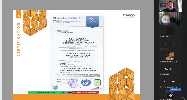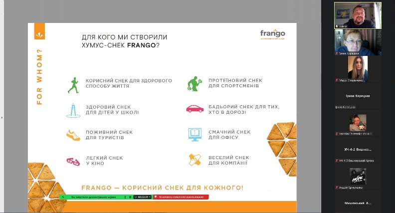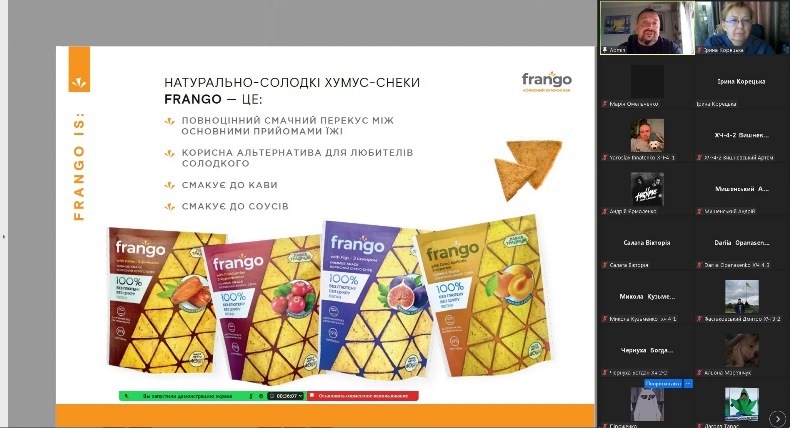 Четвертокусники детально ознайомилися з концепцією бренду Frango, який спеціалізується на виробництві функціональних рослинних снеків, а також із повним циклом створення продукту – від ідеї та підбору сировини до сертифікованого готового виробу. Особливу увагу було приділено: міні-технологіям виробництва нутових хлібців і хумус-снеків; особливостям термічного оброблення; формуванню харчової цінності продукту; підбору інгредієнтів без глютену, лактози, дріжджів, цукру та консервантів; принципам створення 100% веганських продуктів. На основі презентацій компанії Frango було проаналізовано склад продукції, варіативність рецептур, позиціонування на ринку здорового харчування та відповідність вимогам системи управління безпечністю харчових продуктів ДСТУ ISO 22000:2019. Окремо розглядалися питання сертифікації, маркування та вимог до сучасних харчових стартапів.