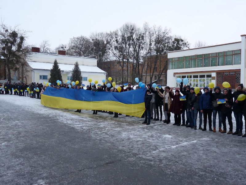 Свою любов до Батьківщини, особливе бачення української державності, минулого та майбутнього нашої країни студенти та викладачі 1-4 курсів передали патріотичним флешмобом «Україна – єдина країна», утворивши живий ланцюг єдності на території коледжу, між першим і другим корпусами, проголошуючи гасла «Слава Україні! Героям Слава!».