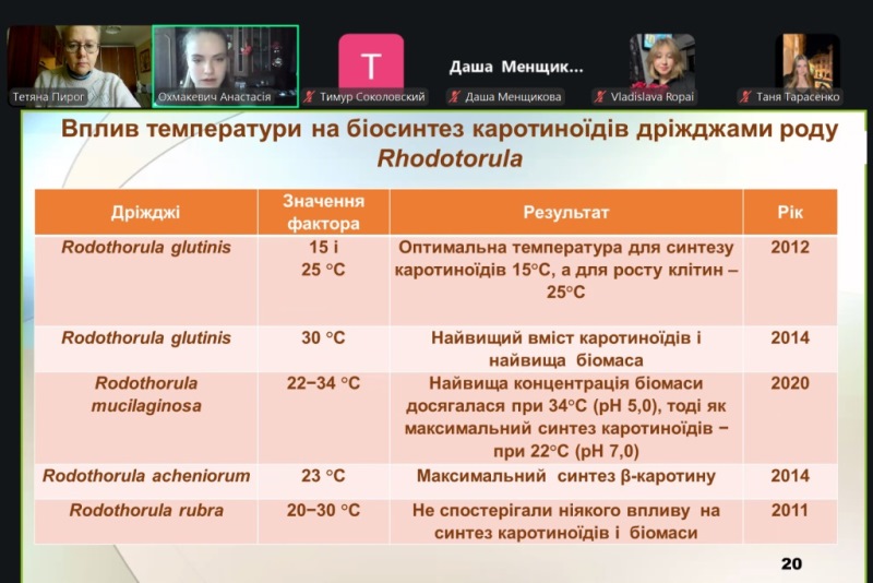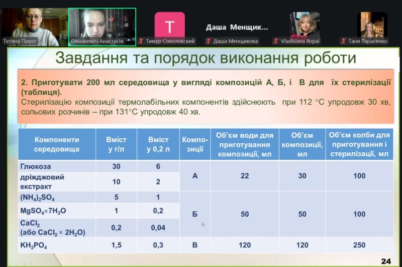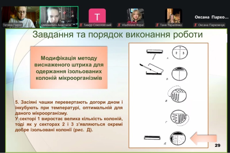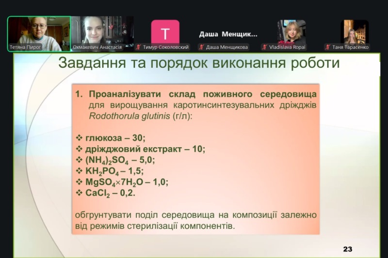 Лабораторне заняття проходило у формі активного обміну думками між практиканткою, здобувачами та викладачкою. На початку заняття було розглянуто основні теоретичні відомості: структурні формули бета-каротину, лікопіну та астаксантину, їхні властивості, застосування у промисловості, природні та удосконалені продуценти каротиноїдів, вплив умов культивування дріжджів R. glutinis на біосинтез каротиноїдів. Під час обговорення практичної частини роботи увага приділялася принципам поділу компонентів поживного середовища на композиції, підготовці робочої культури R. glutinis шляхом посіву до ізольованих колоній, а також посівного матеріалу продуцента бета-каротину. На завершення заняття Анастасія роз’яснила порядок виконання наступного пошукового індивідуального завдання для здобувачів освіти та доброзичливо надала відповіді на запитання.