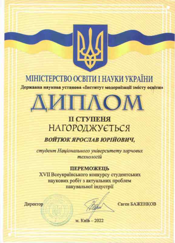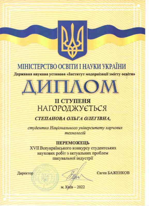 У номінації «Технологія та обладнання для виготовлення пакувальних матеріалів та упаковки» друге місце посіла й була нагороджена дипломом ІІ ступеня Ольга Степанова за конкурсну роботу «Розробка конструкції та технології виготовлення картонної споживчої упаковки для стаканчиків із йогуртом».