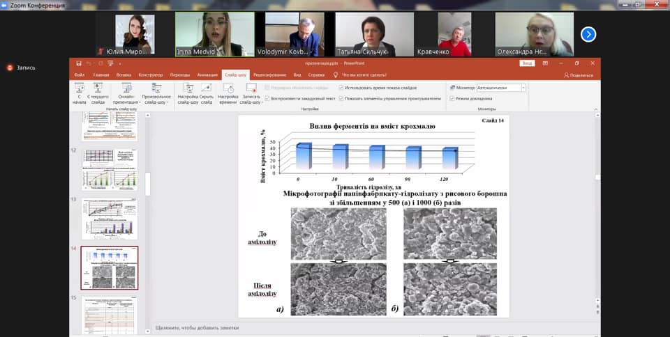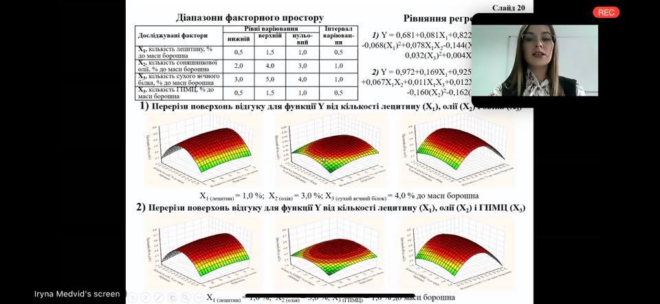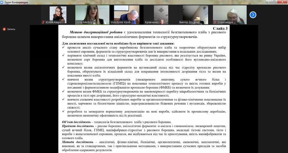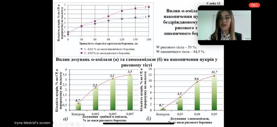 Ірина Медвідь представила результати наукових досліджень із обґрунтування та удосконалення технології безглютенового хліба з рисового борошна з використанням амілолітичних ферментів і структуроутворювачів. У дисертаційній роботі здобувачем доведена доцільність спільного використання знежиреного лецитину, соняшникової олії і як структуроутворювачів – сухого яєчного білка та ГПМЦ у рецептурній композиції удосконаленого безглютенового хліба в поєднанні зі ферментативною модифікацією крохмалю рисового борошна.