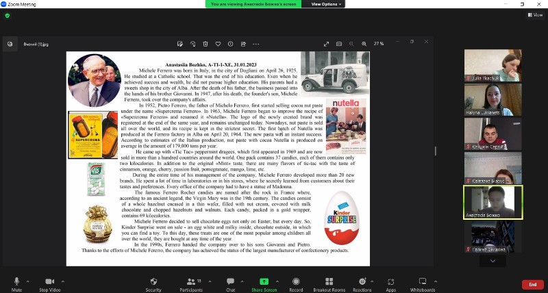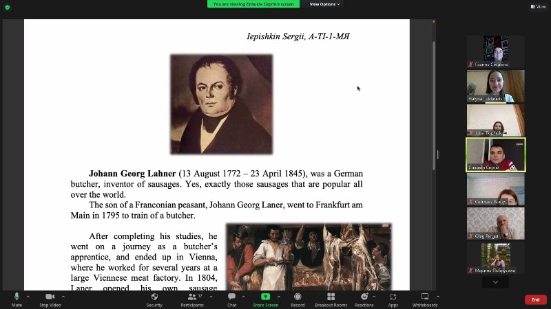 Під час практичного заняття, за присутності великої кількості гостей-викладачів кафедри, визначили сутність поняття lingua franca, обговорили важливість знання мови міжнародного спілкування у сферах науки та технологій (колись латини, згодом англійської), пригадали значення поширених префіксів і суфіксів латинського походження в англомовному словнику (ad-, auto-, bi-, bio-, carn-, di-, micro-, etc.), вивчили правила утворення однини та множини іменників-наукових термінів (criterion – criteria; basis – bases) та виявили актуальні джерела-словники для пошуку транскрипції, морфологічних даних і дефініцій наукових термінів латинського походження. Більше того, заслухали доповіді здобувачів про відомих науковців, тренувались ставити запитання доповідачу після прослуховування презентації, вдосконалили ряд гнучких навичок: пошуку інформації, вміння працювати в міні-групах та приймати рішення.